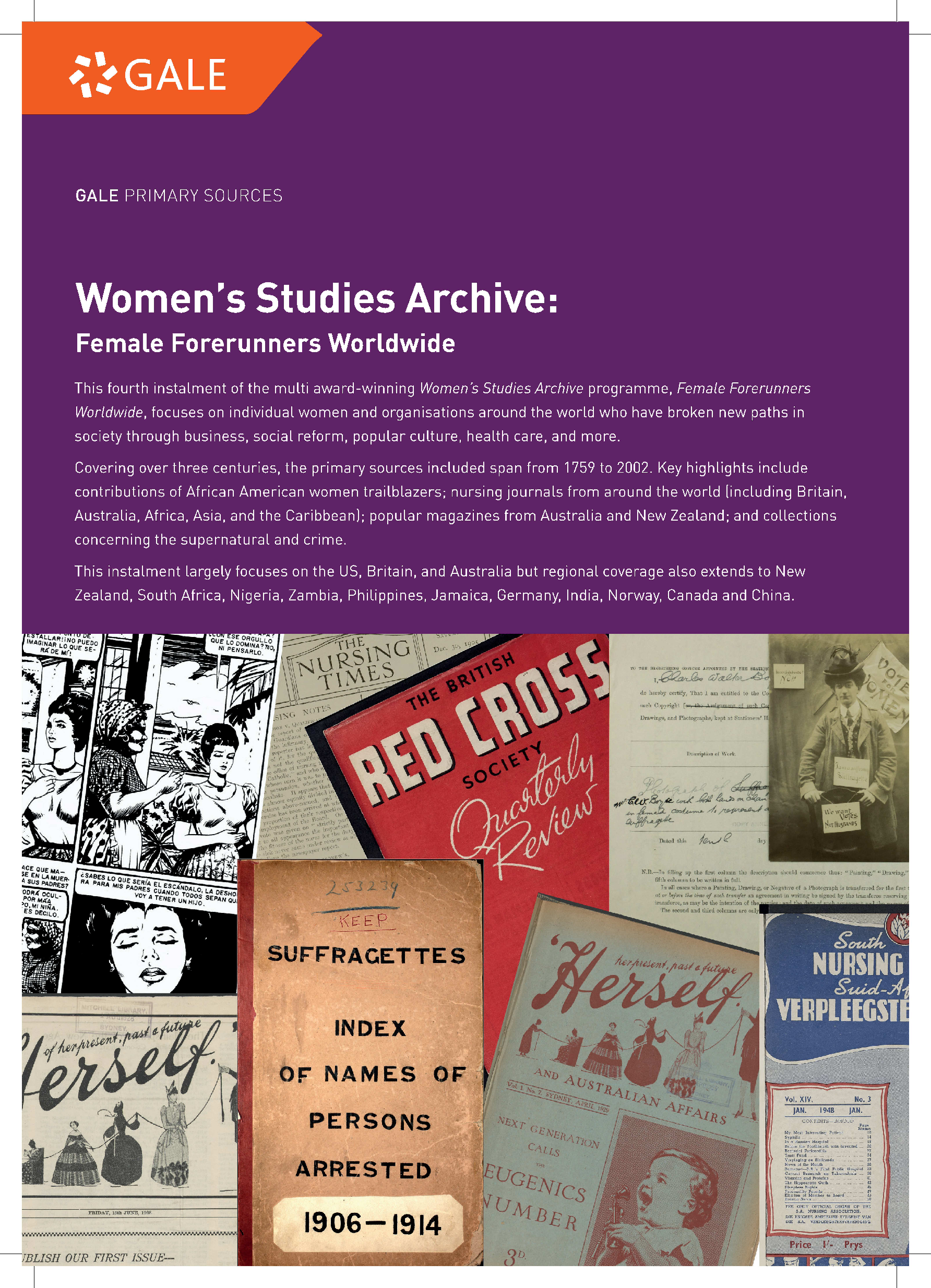“全球女性先驱者”聚焦对社会产生影响的女性个人和组织,收录的女性史典藏围绕广告、计划生育和性教育、公民权利运动、健康护理和医学中的女性、宗教和女性传教工作等。其中收录的文献资料主要来自于1741年至1986年,重点关注美国、